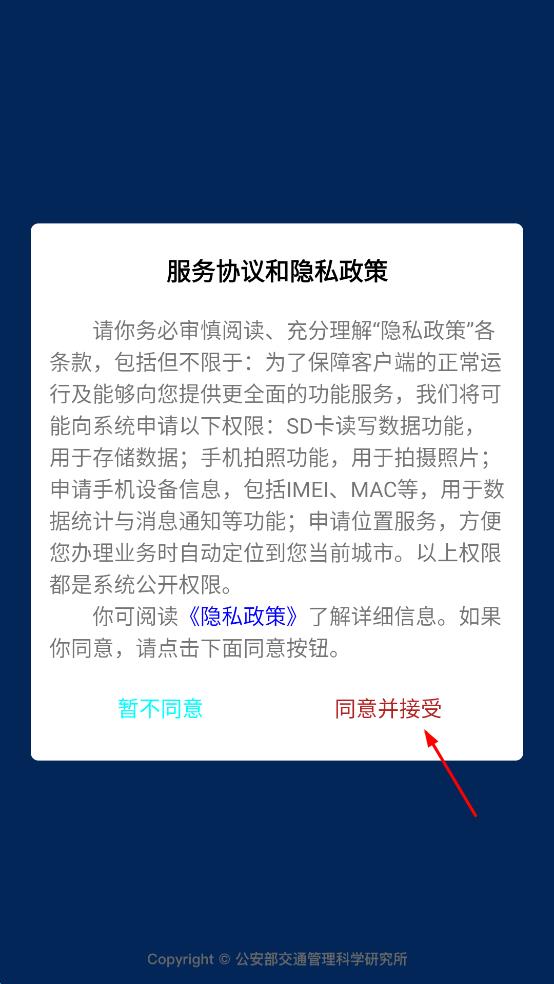 1、打开交通管理类APP,在弹出的服务协议和隐私政策提示框中,点击“同意并接受”按钮。