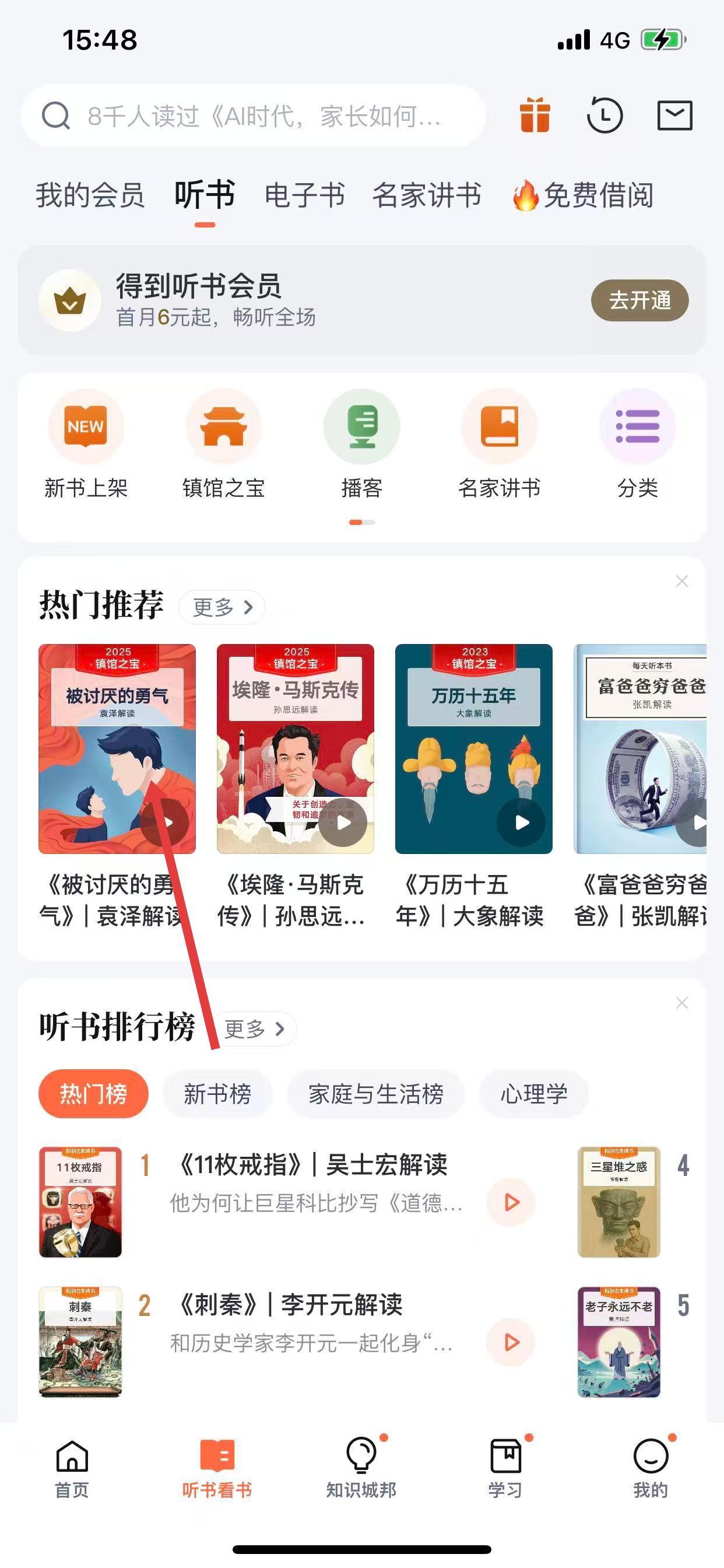 2、进入听书看书页面后,在听书板块下,选择你感兴趣的书籍。