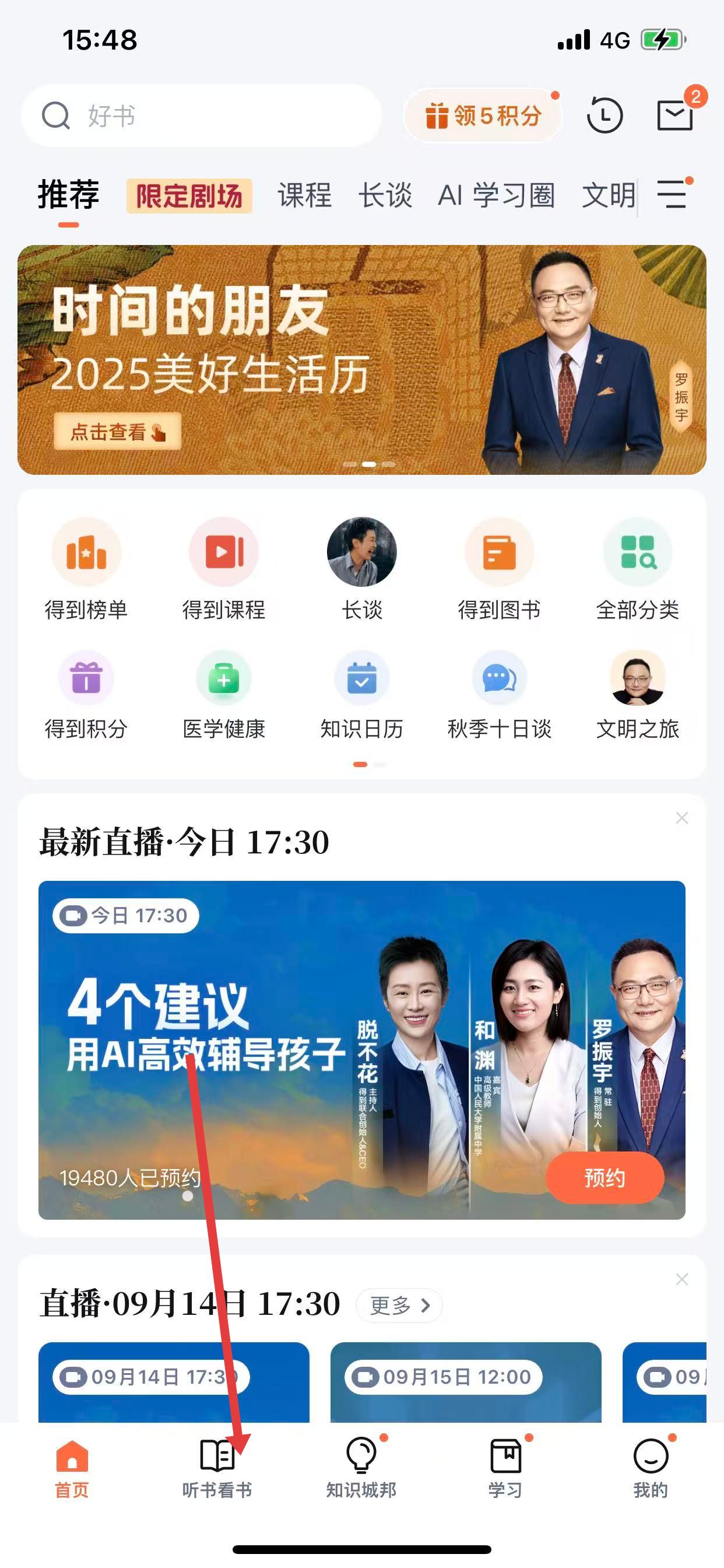 1、打开得到App,点击底部导航栏中的听书看书选项。