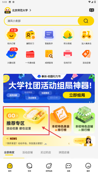 1、打开校园类生活服务应用北京师范大学相关,点击推荐专区选项,进入推荐专区页面。