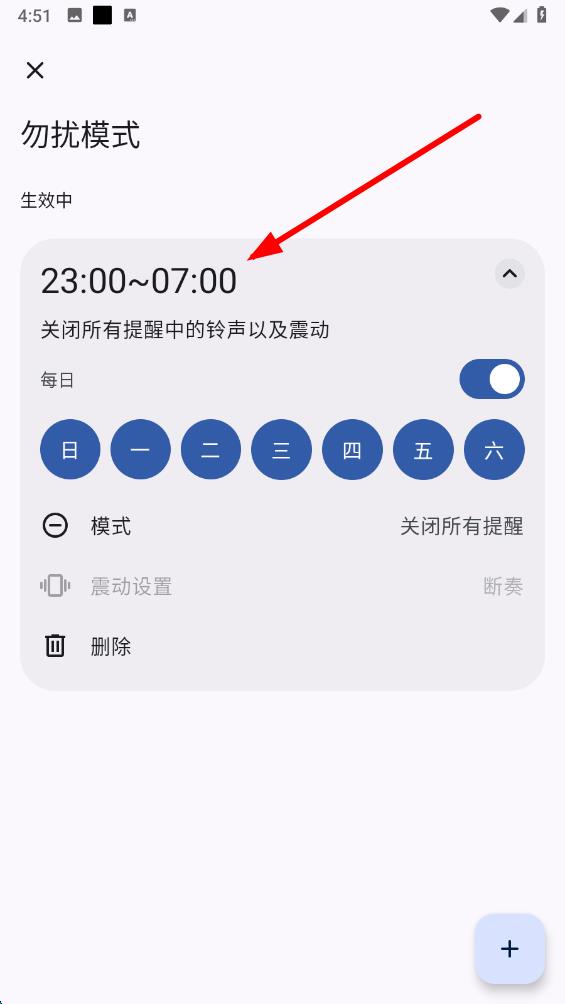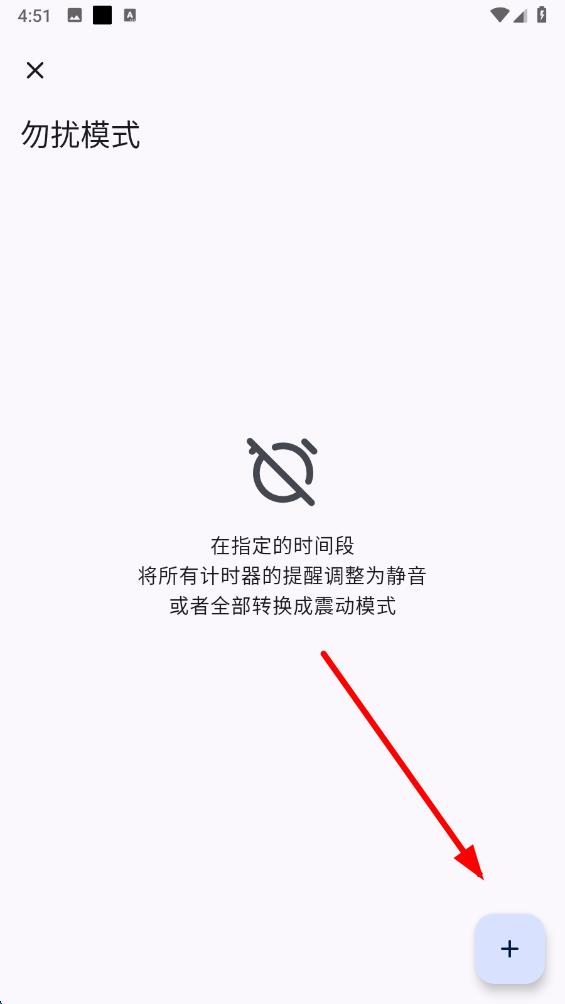 3、在勿扰模式设置页面,点击右下角的按钮,添加新的勿扰时间段。