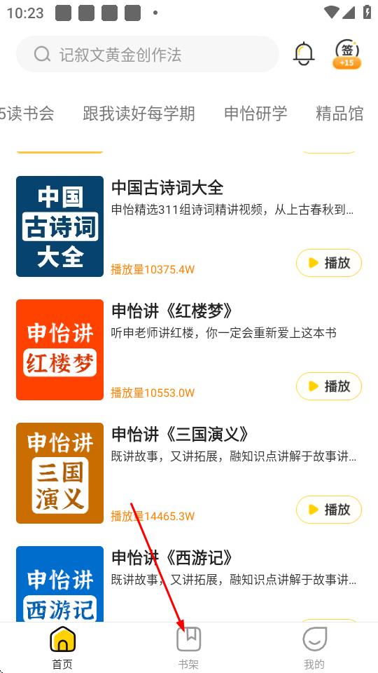 1、打开申怡读书App,找到想要听的书籍,点击书籍右侧的播放按钮。