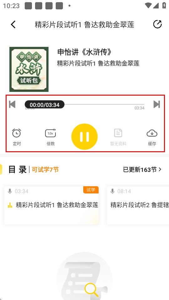 2、进入书籍播放页面后,自动播放音频内容,也可点击播放控制区域来调整。