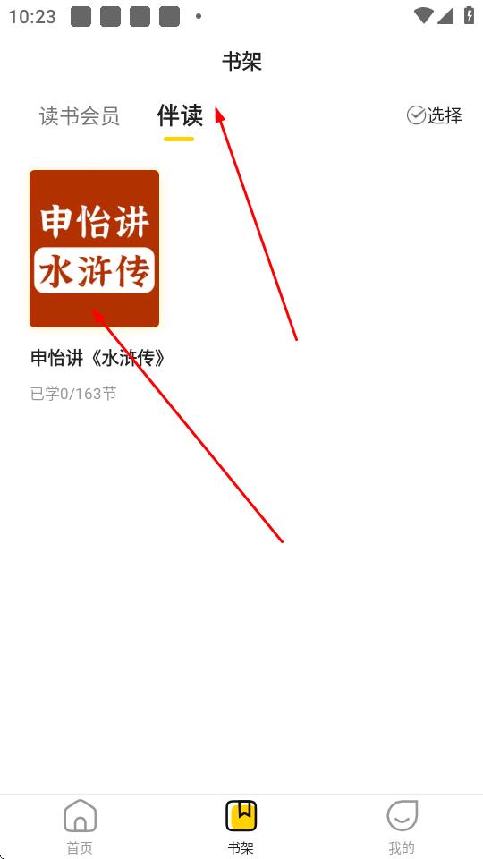 4、在书架页面的伴读分类下,能看到已添加的书籍,点击书籍即可继续听书。