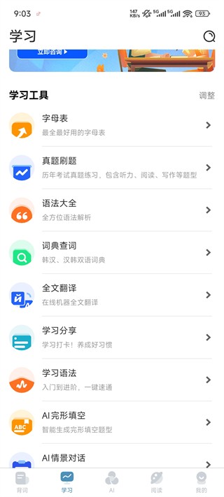 5、AI板块拥有"真人级口语陪练、分层语法精讲(含敬语解析及韩剧例句)与全能韩语词典(单词详解+拍照翻译)三位一体的韩语学习助手,覆盖日常对话、追星交流、旅行应急等场景,支持从发音到语法的全维度学习需求。