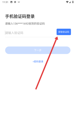 3、点击获取验证码按钮,在获取到验证码后点击输入框填写后进入下一步。