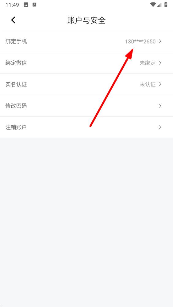4、在账户与安全界面中,点击当前绑定的手机号选项,进入更换手机号码页面。