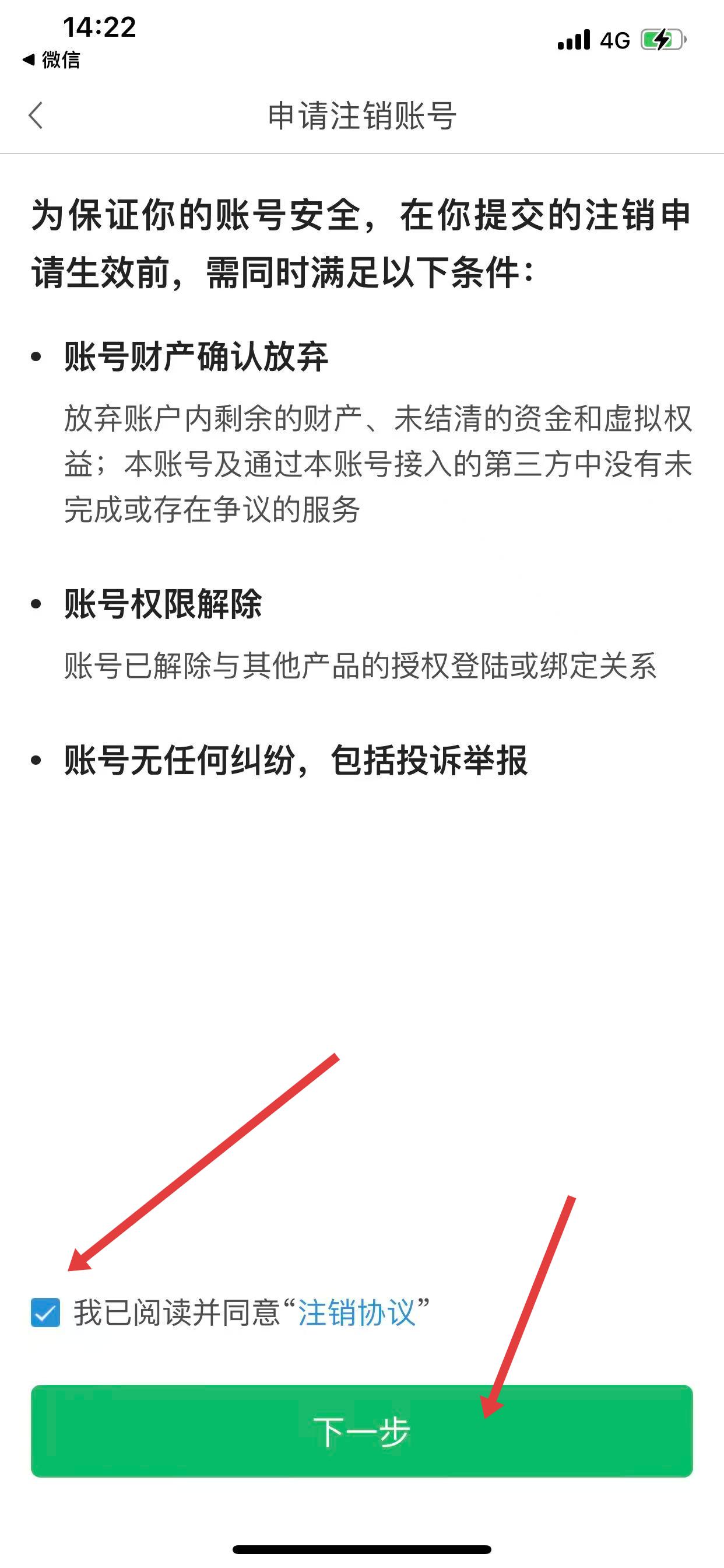 4、阅读注销条件,勾选同意注销协议后,点击下一步。