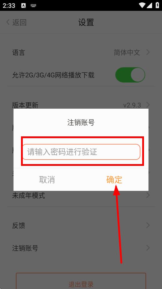 4、在弹出的注销账号窗口中,输入账号密码进行验证,点击确定,按照步骤完成即可注销。