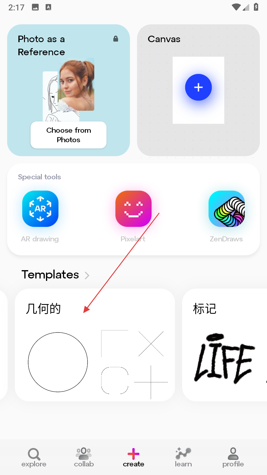 1、打开素描画图AR大师应用,在create页面中找到Templates板块,点击几何的模板选项,进入几何图形展示页面。