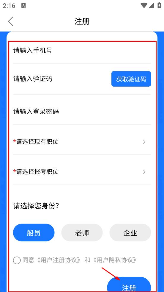 4、获取验证码并输入验证码,设置登录密码,选择现有职位、报考职位以及身份,勾选同意协议,然后点击“注册”按钮,完成新用户注册。
