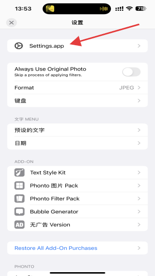 3、进入设置的界面内,再次点击Settings.app的按钮。