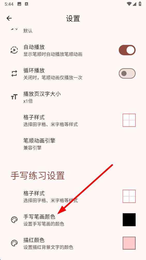 3、在设置页面里,下滑找到手写练习设置板块,点击手写笔画颜色选项。