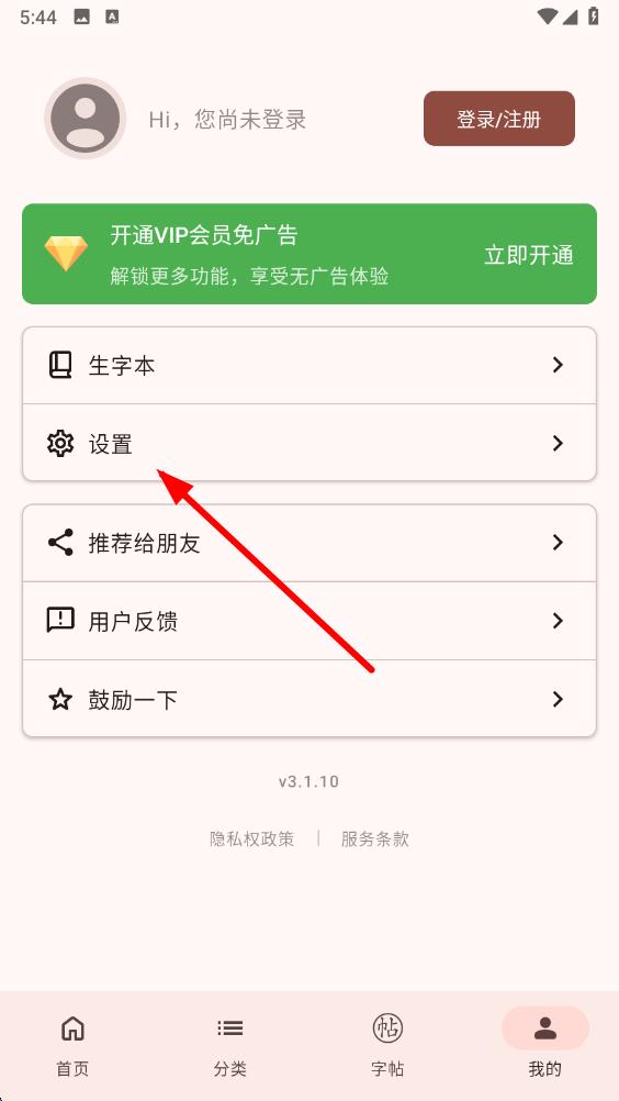 1、打开笔顺笔画大全app,点击底部导航栏最右侧我的,进入个人相关界面。