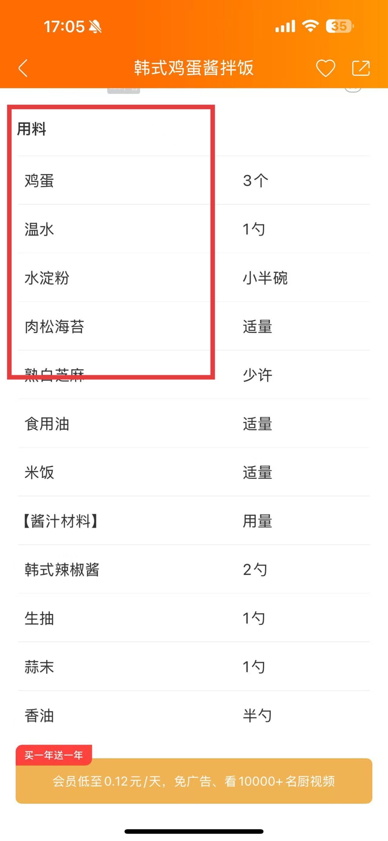 3、继续浏览,能看到这道菜的用料,有鸡蛋3个、温水1勺、水淀粉小半碗、肉松海苔适量等食材。