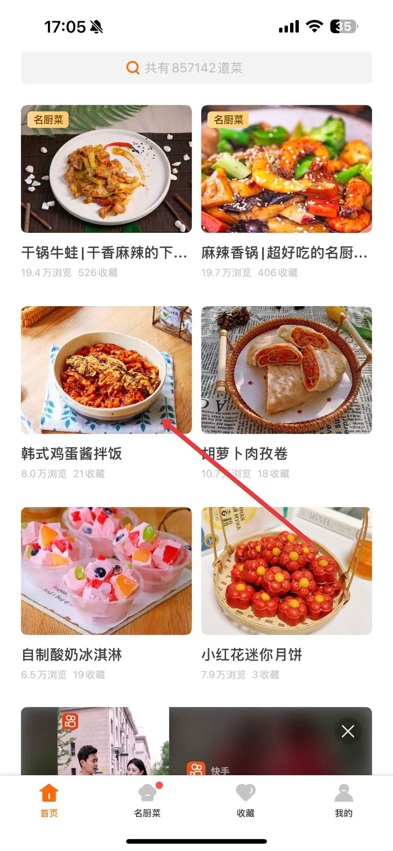 1、打开家常菜谱大全软件首页,能看到众多菜品,有干锅牛蛙、麻辣香锅等,还有韩式鸡蛋酱拌饭等菜品可选择。