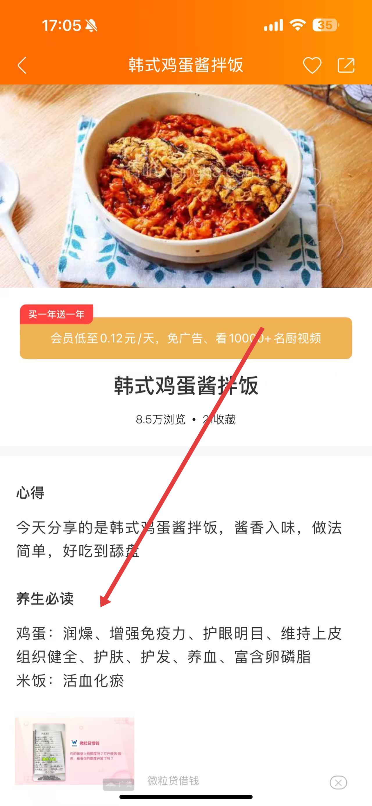 2、进入韩式鸡蛋酱拌饭页面,可看到菜品相关介绍,还有养生必读板块,介绍鸡蛋能润燥、增强免疫力等,米饭可活血化瘀。