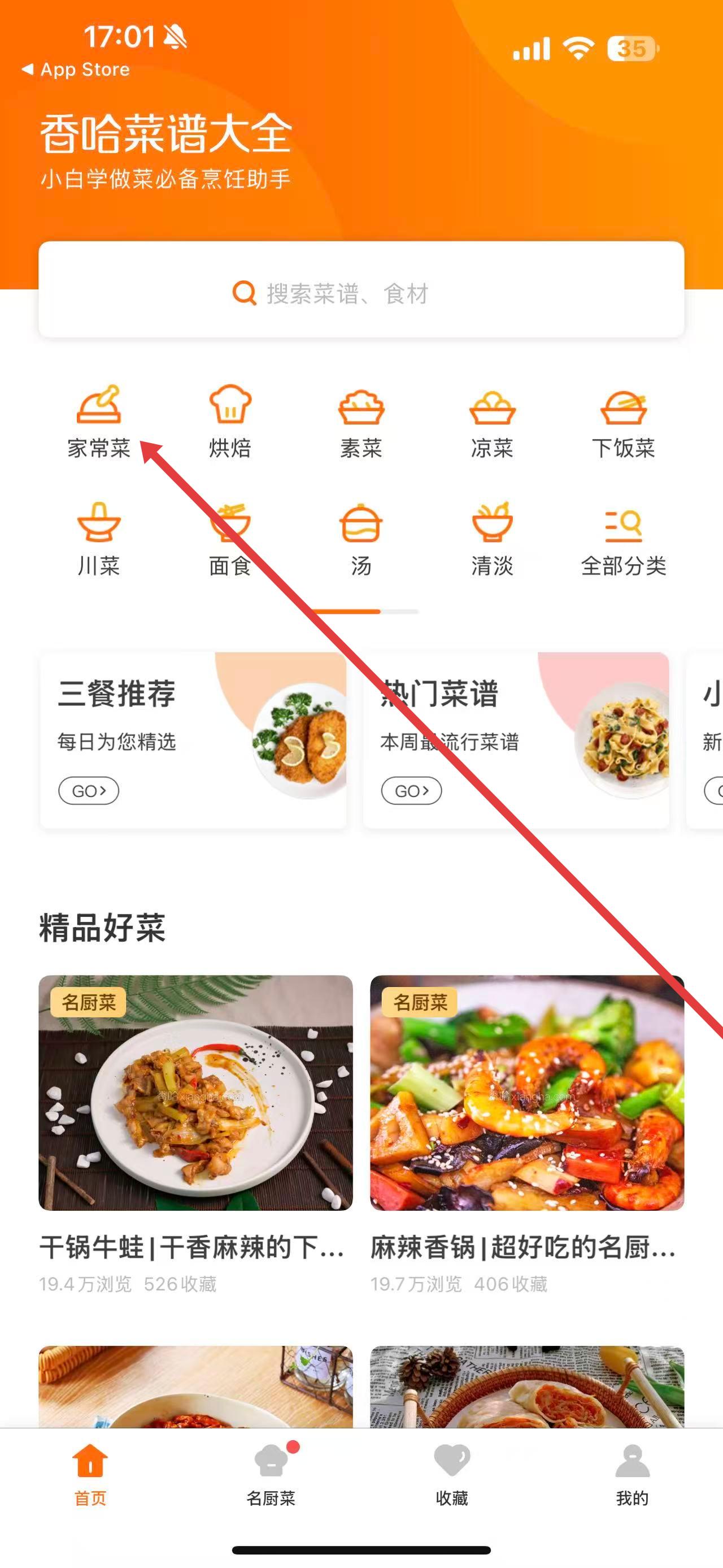 1、打开家常菜谱大全软件,点击首页中的家常菜分类。