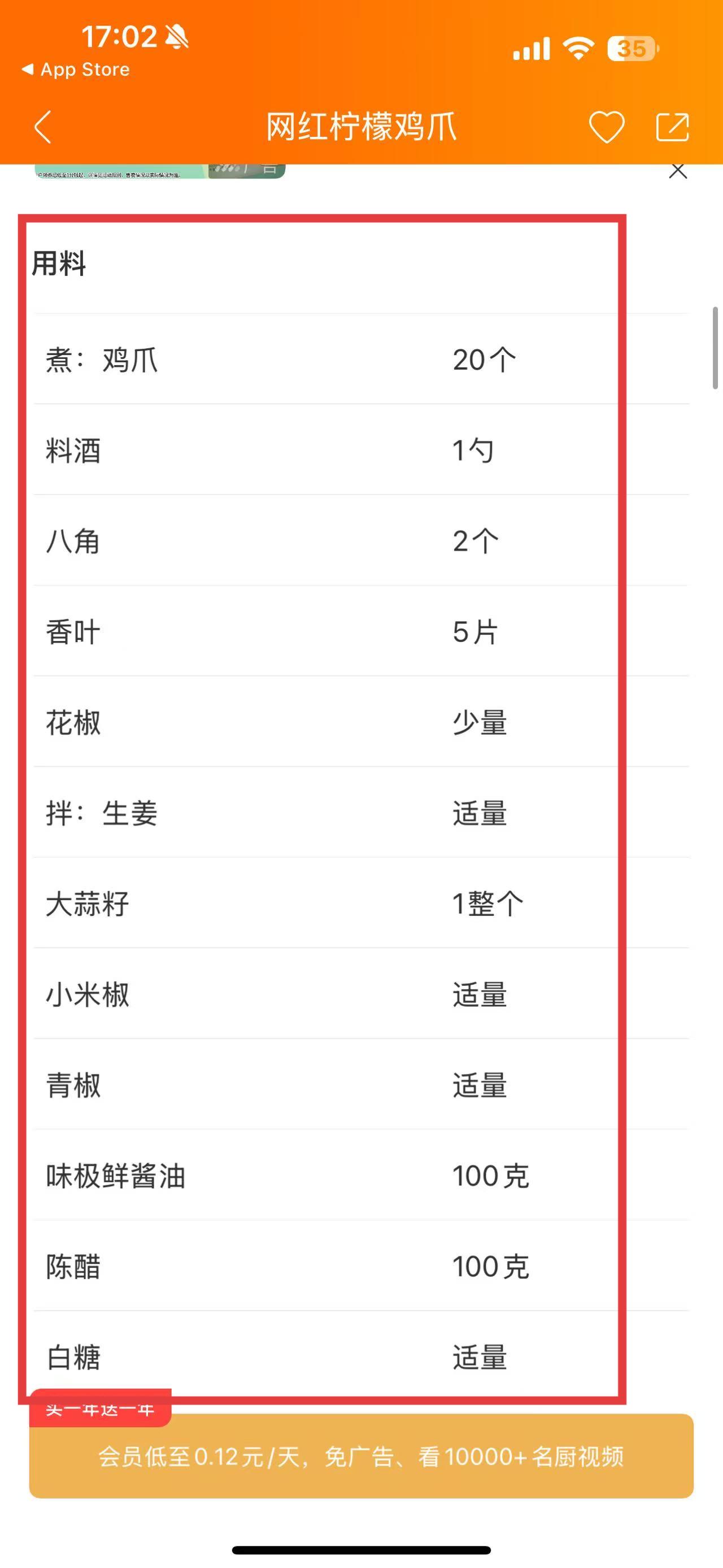 3、进入菜品页面后,查看所需用料,准备好鸡爪、料酒、八角等食材。