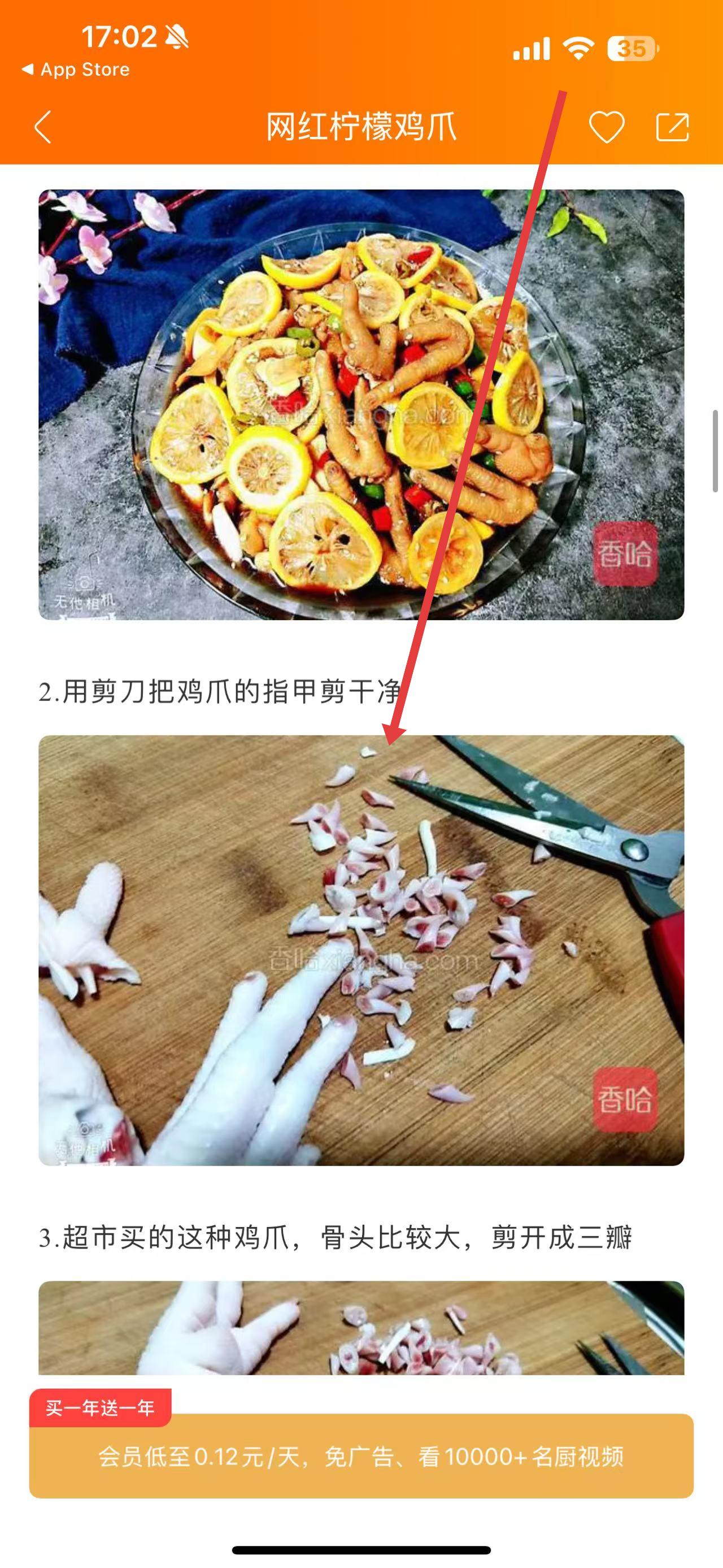 4、下滑页面,按照详细的步骤说明,如先剪去鸡爪指甲等操作,完成菜品制作。
