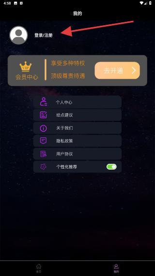 2、在我的页面内,点击登录/注册的区域。