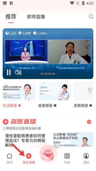 2、医生直播页面,分推荐、即将直播板块,涵盖多频道,呈现名医在线科普,提供疾病相关讲解。