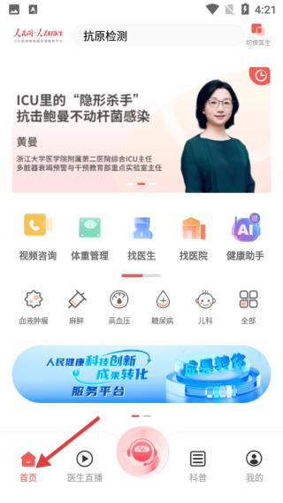 2、如果你之前是普通用户身份登录,则可以在应用首页处点击右上角的【切换医生】图标(下图绿色箭头所指)
