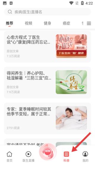 3、点科普页面,含推荐、视频等分类,展示原创健康文章,如养生、疾病知识等,助力提升健康认知。