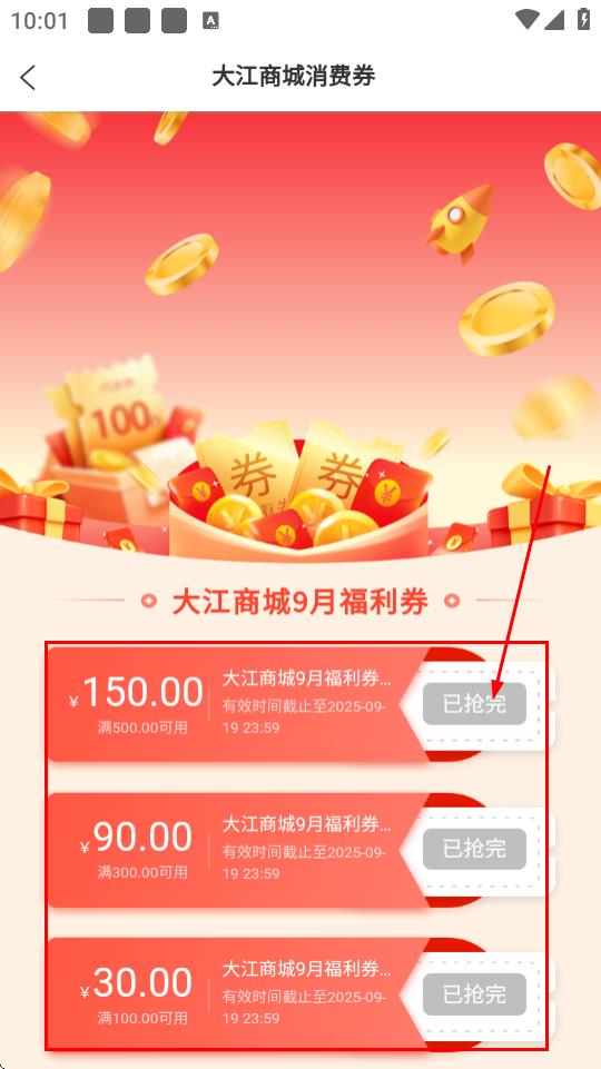 4、在消费券领取页面,选择可领取的消费券,点击领取按钮,显示已抢完则当前无法领取。