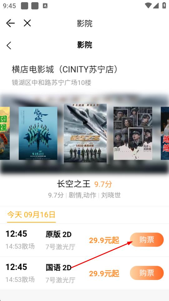 4、进入影院排片页,选好日期、场次及影片版本,点击购票并完成支付。