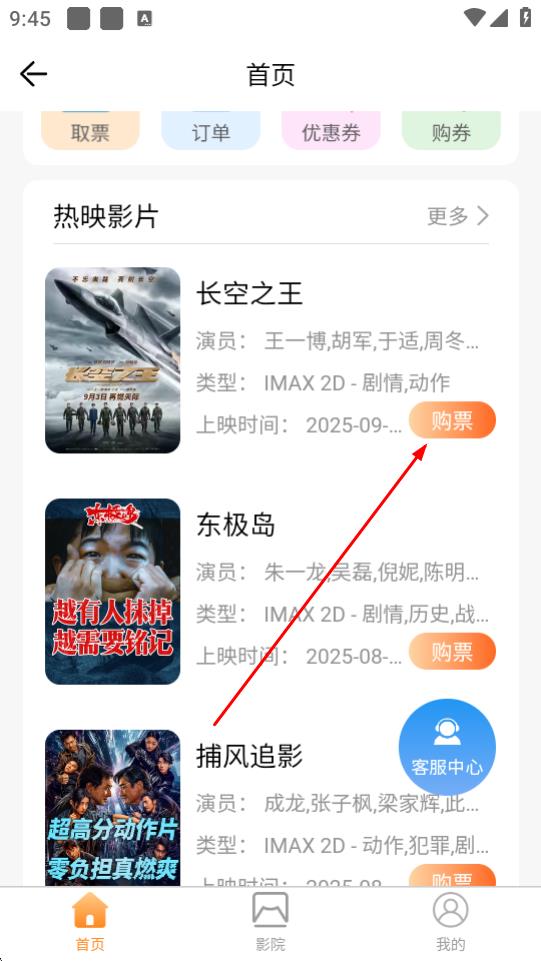 2、在服务页面看看影音板块,进入电影购票界面,点击热映影片右侧购票按钮。