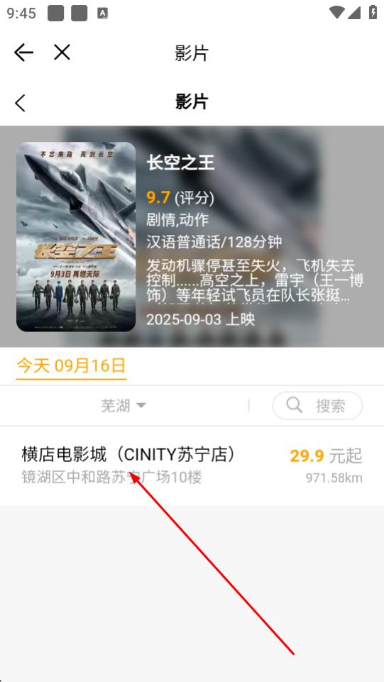 3、进入影片详情页,选择所在城市和观影影院。