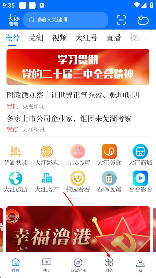 1、打开大江看看App,点击底部导航栏服务选项。