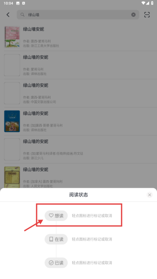 4、在弹出的阅读状态选择框中,点击想读选项,设置该书的阅读状态为想读。