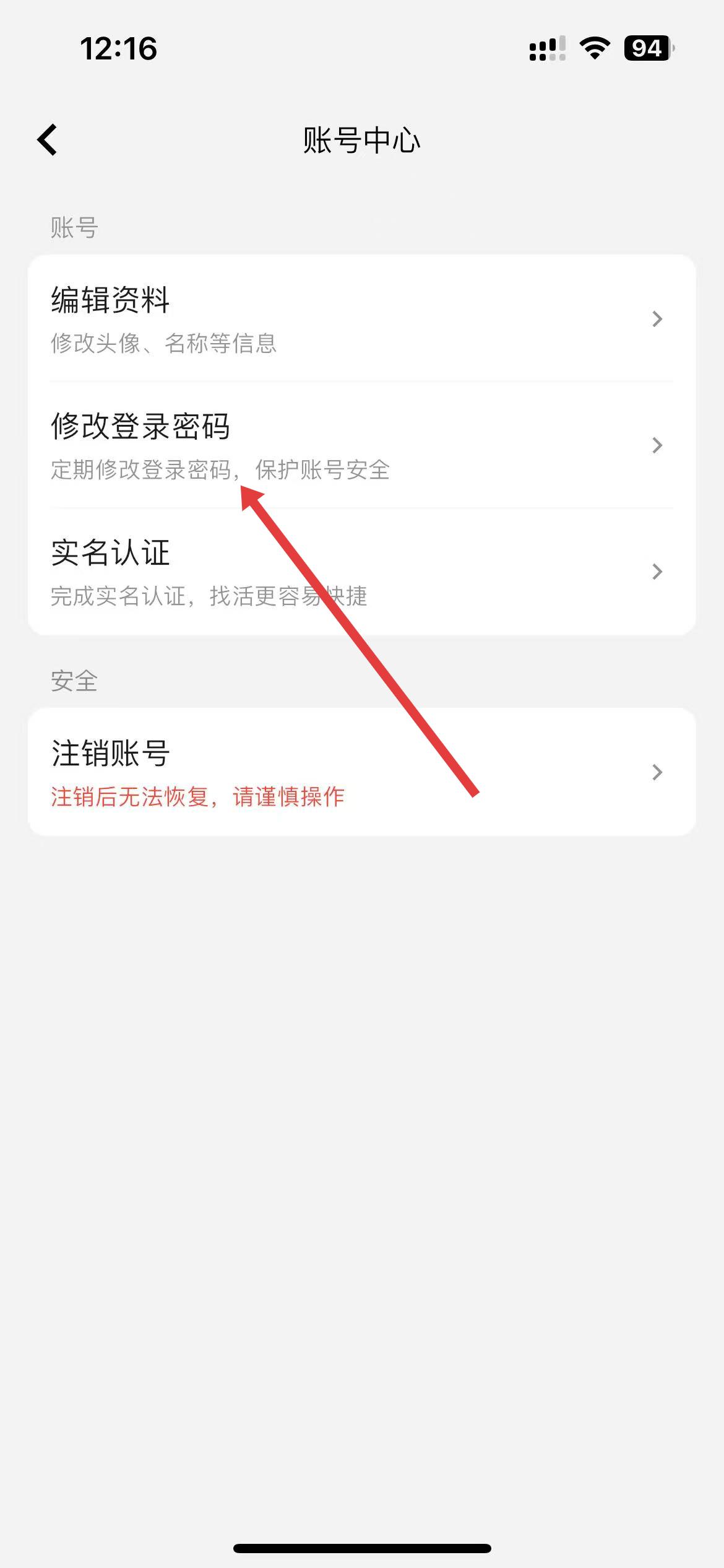 4、在账号中心里,选择修改登录密码的选项,比如修改密码页面。
