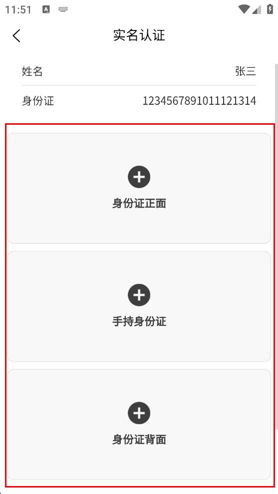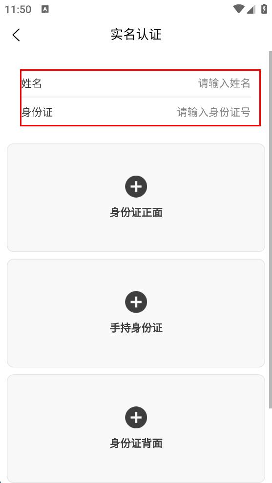 4、填写好姓名和身份证号后,依次点击“身份证正面”“手持身份证”“身份证背面”对应的“+”号,上传相应的身份证照片,完成实名认证流程。