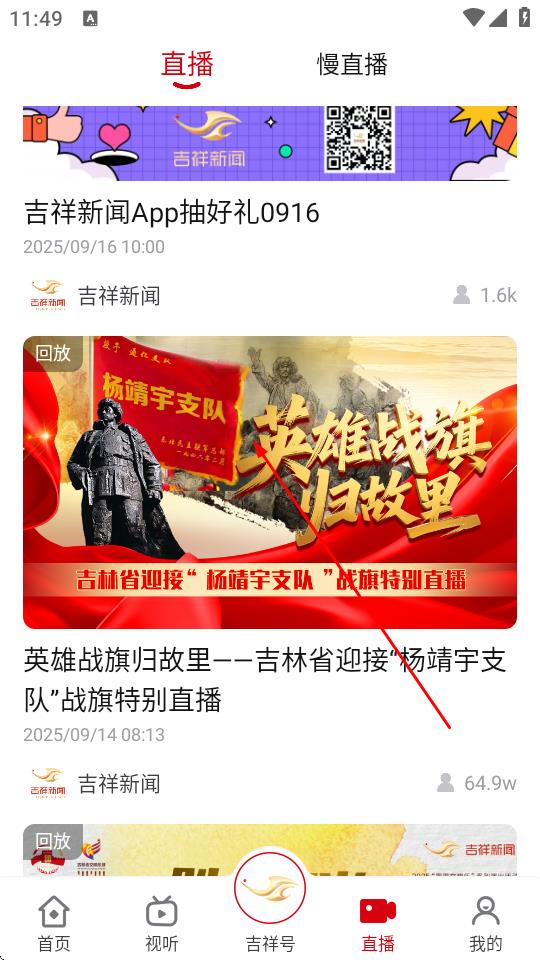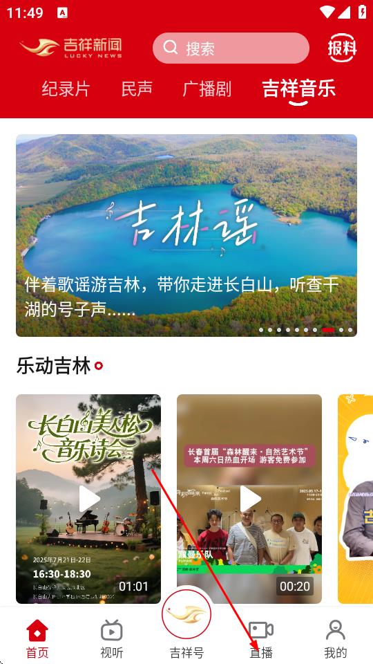1、打开吉祥新闻App,点击底部导航栏中的直播选项。