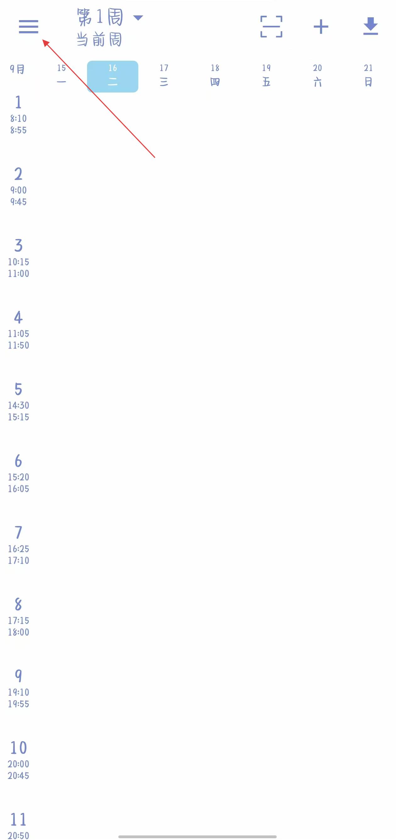 1、打开Simple课程表,点击界面左上角三条横线样式的菜单按钮,展开侧边栏菜单。