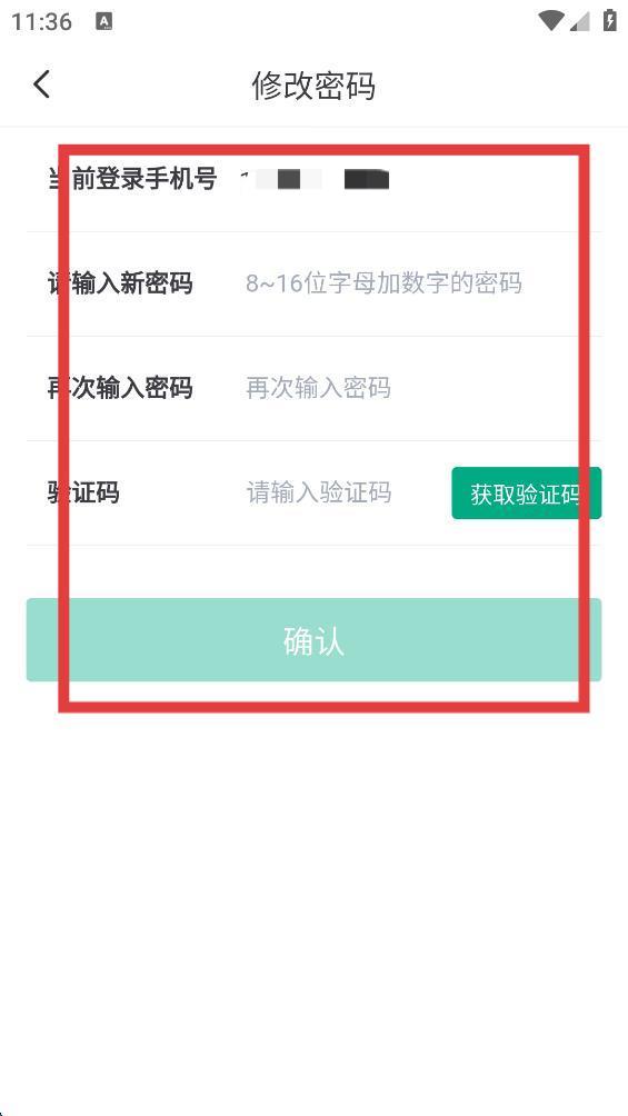 4、在修改密码界面,输入密码和收到的验证码,点击确认,即可完成密码修改操作。