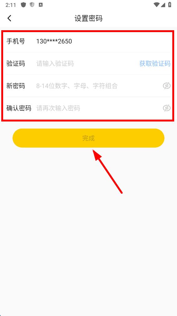4、在设置密码界面,获取验证码,设置新密码,点击完成,即可修改密码。