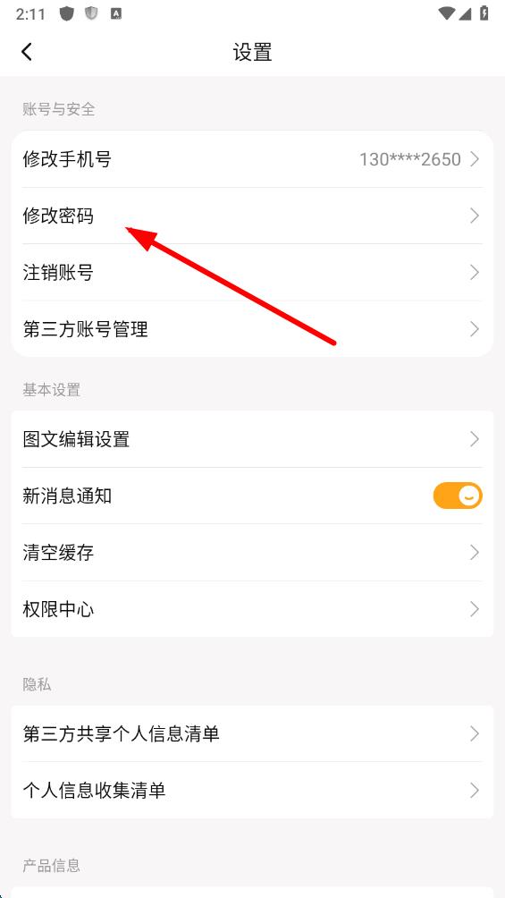 3、在设置页面中,找到修改密码选项并点击,进入设置密码界面。