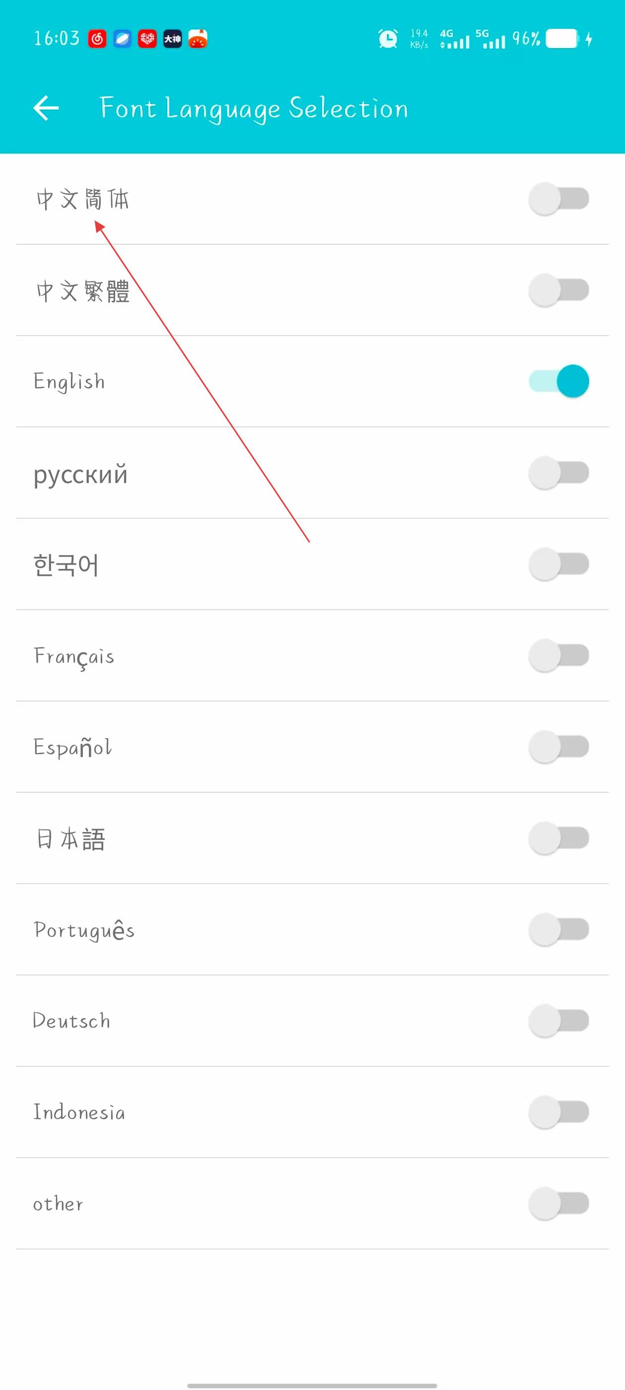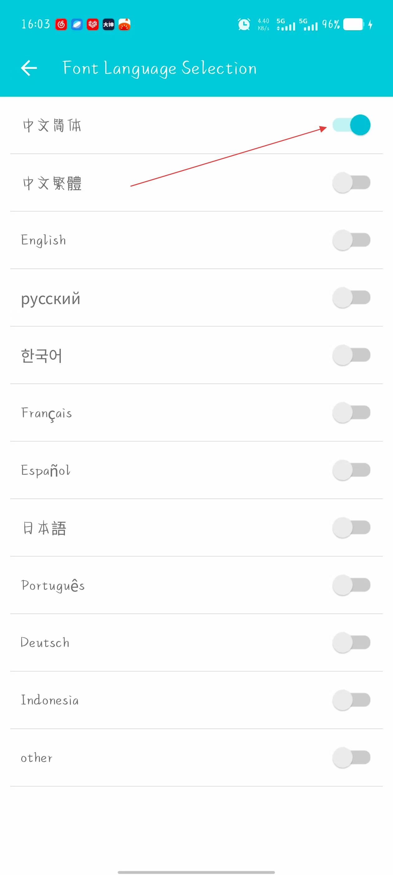 4、将右侧的开关按钮开启,字体管家便成功切换为中文模式。