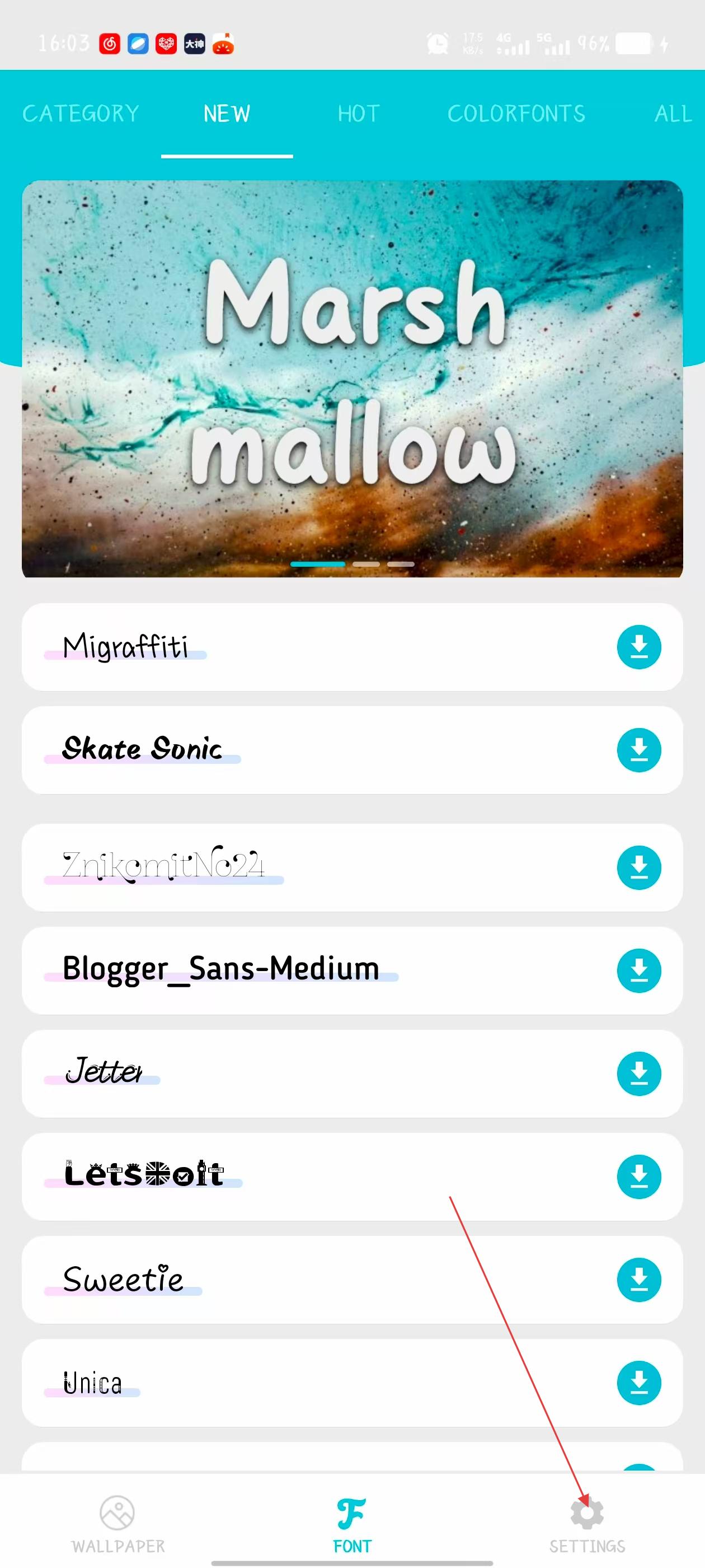 1、打开字体管家软件,进入首页后,点击界面右下角的SETTINGS,进入设置页面。