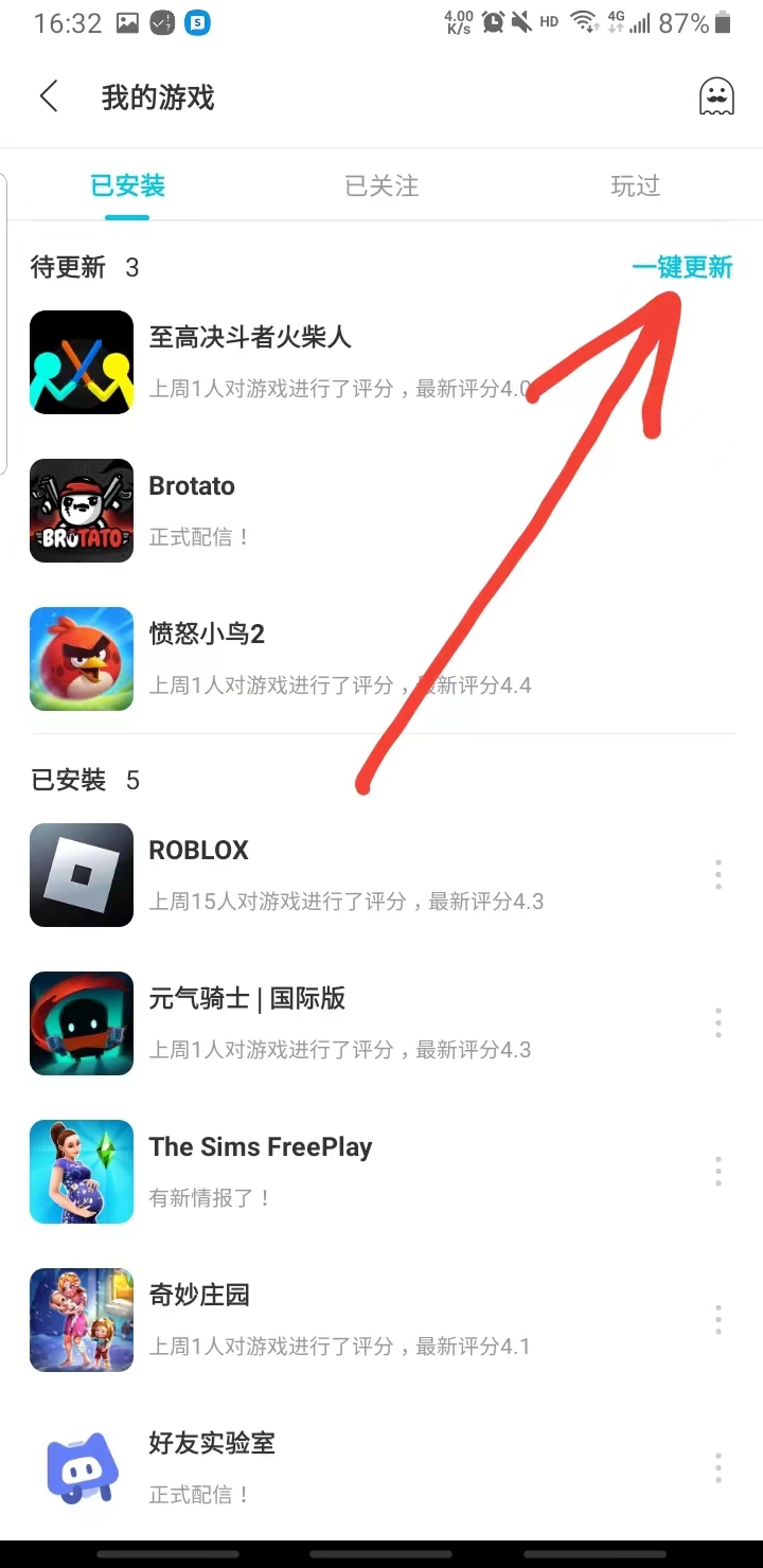 2.进入我们已经安装的游戏列表,分两种情况,第一种是点击一件更新,就可以把我们的游戏中的旧版本游戏更新成最新版