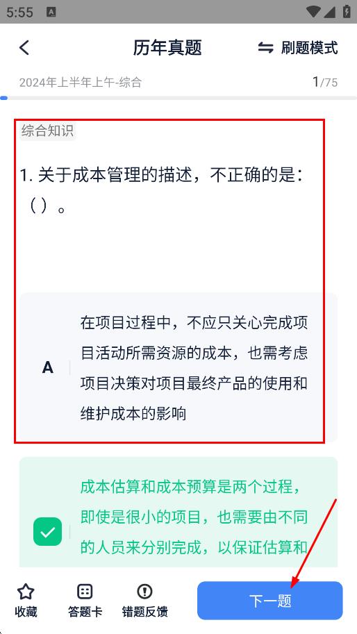4、随后在真题题目页面,可查看题目并点击下一题继续刷题。
