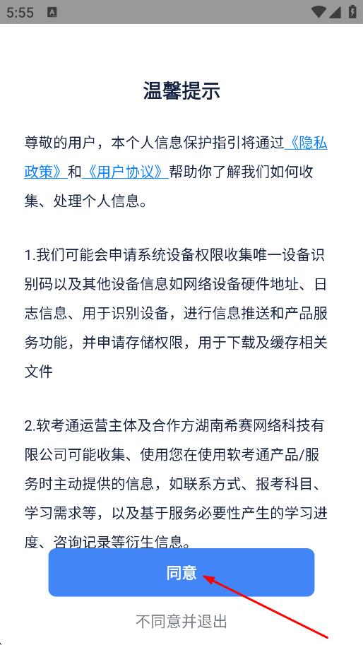 1、在温馨提示弹窗中,点击同意,进入软考应用主页面。