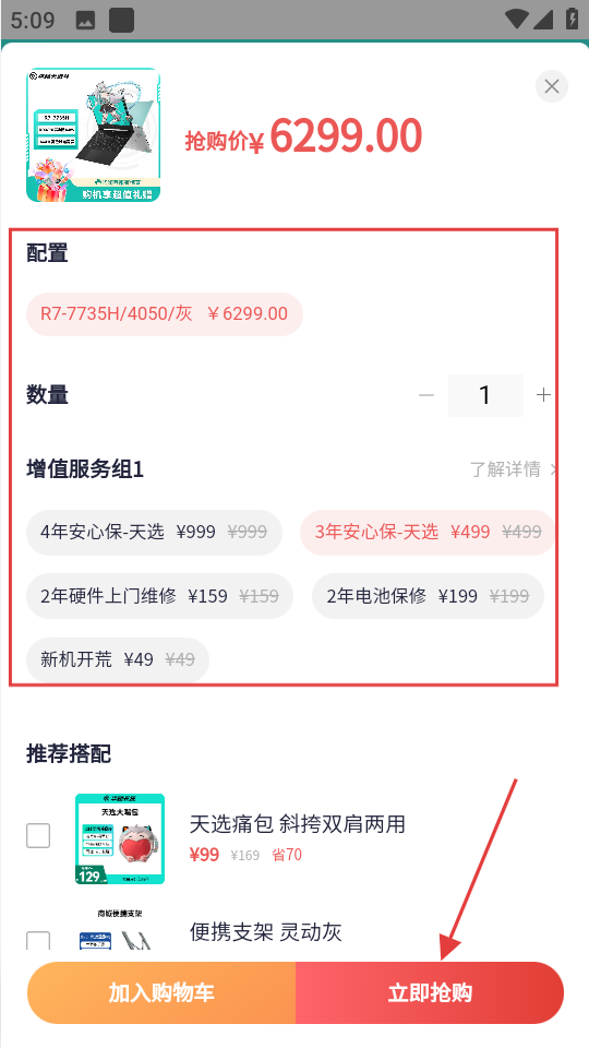 4、在弹出的配置选择页面,选好配置、数量及增值服务后,点击立即抢购完成购买。