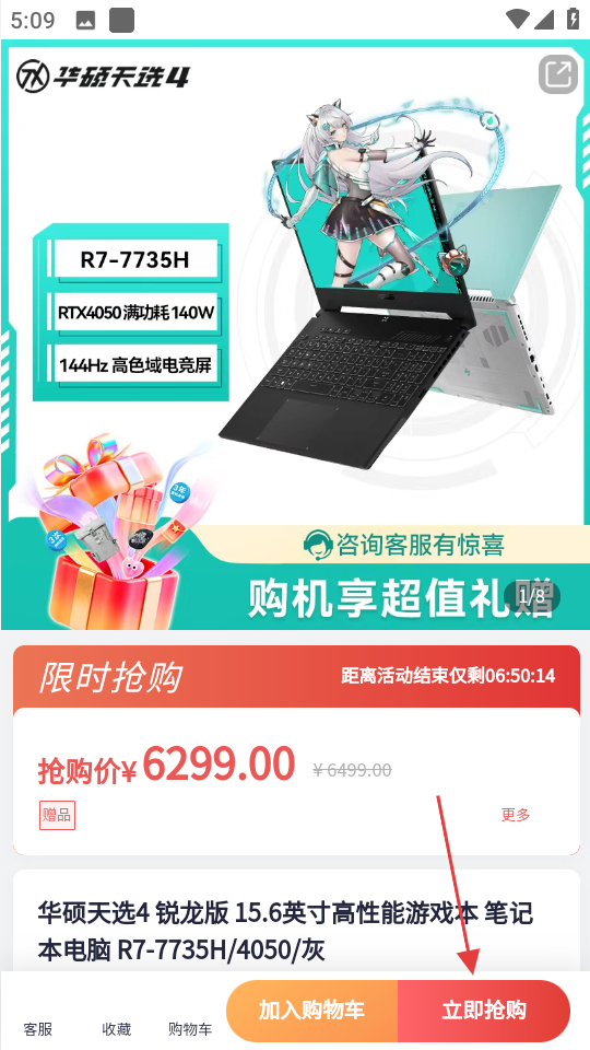 3、进入商品详情页后,若要购买,点击底部立即抢购按钮。
