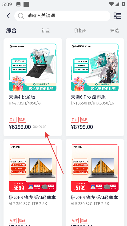 2、在笔记本商品列表中,挑选心仪的笔记本,比如天选4锐龙版,点击进入商品详情页。