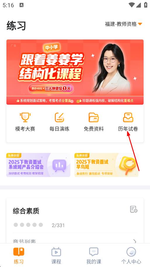 2、在练习页面,点击历年试卷,进入历年试卷页面。